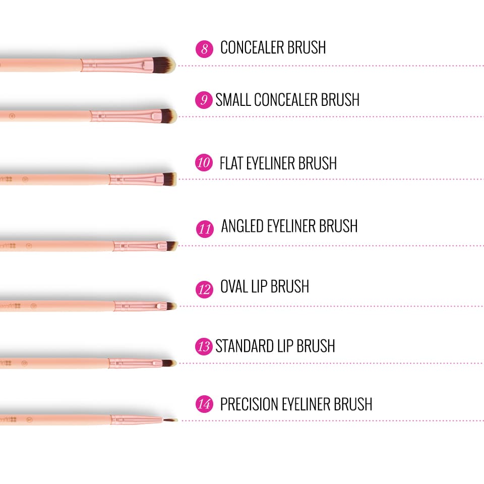 Blush, blend, line and define with our pale pink BH Chic 14 Piece Brush Set, a collection of professional-quality brush essentials for face, eyes, and lips. The two-tone synthetic brushes can be used with liquids, creams and powders to achieve precise makeup application, allowing you to create flawless looks ranging from subtle to striking. Brushes come in a matching zip-up case with room to stash additional items.