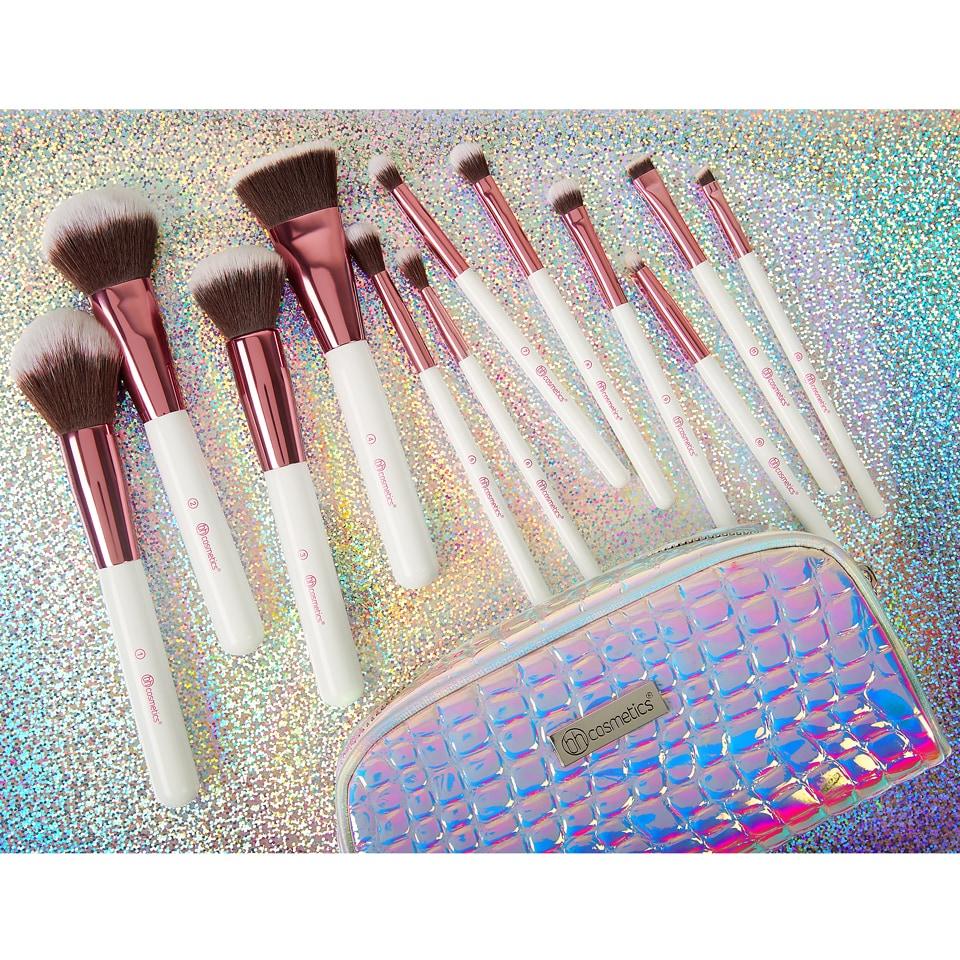Enchant your beauty routine with our Crystal Quartz 12 Piece Brush Set, a collection of top-quality face and eye brushes. Featuring soft, synthetic bristles for liquid, cream and powder application, these brushes can be used to create a rainbow of magical effects. The set comes in an ethereal, iridescent zip-top case brush bag for convenient storage and travel.